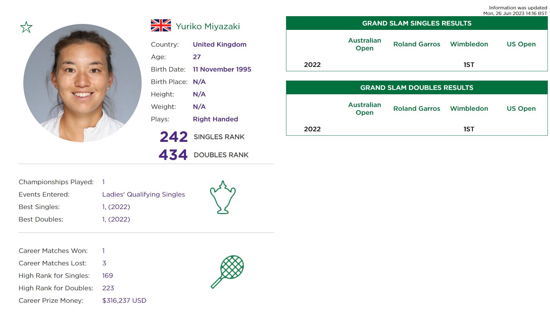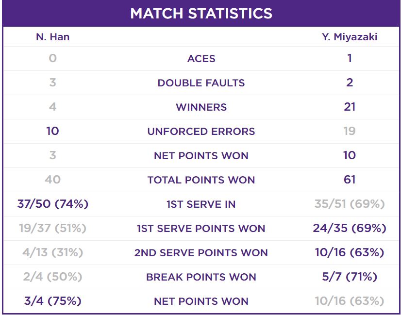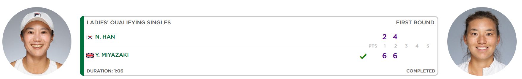 테니스, 2023 윔블던 예선 1회전 한나래 vs 유리코 미야자키