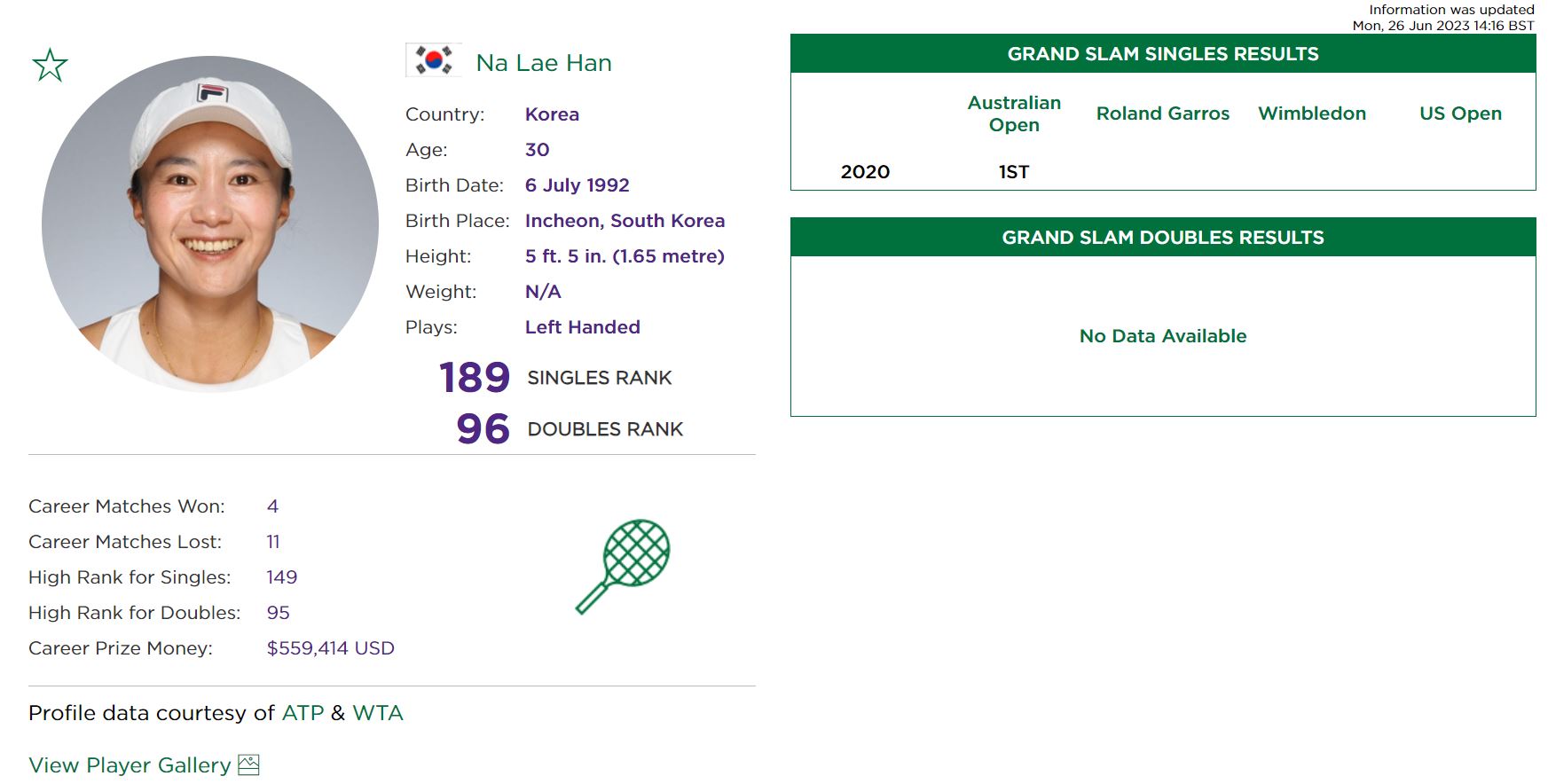 한나래 선수는 랭킹 189위