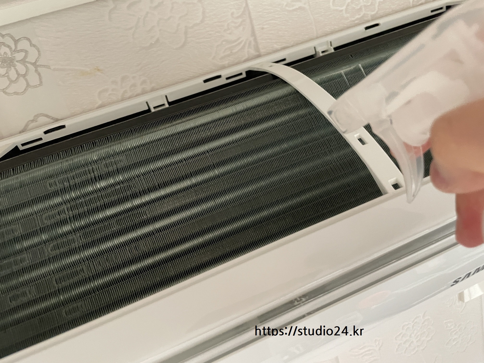 벽걸이형 에어컨에 열심히 뿌려주었어요.