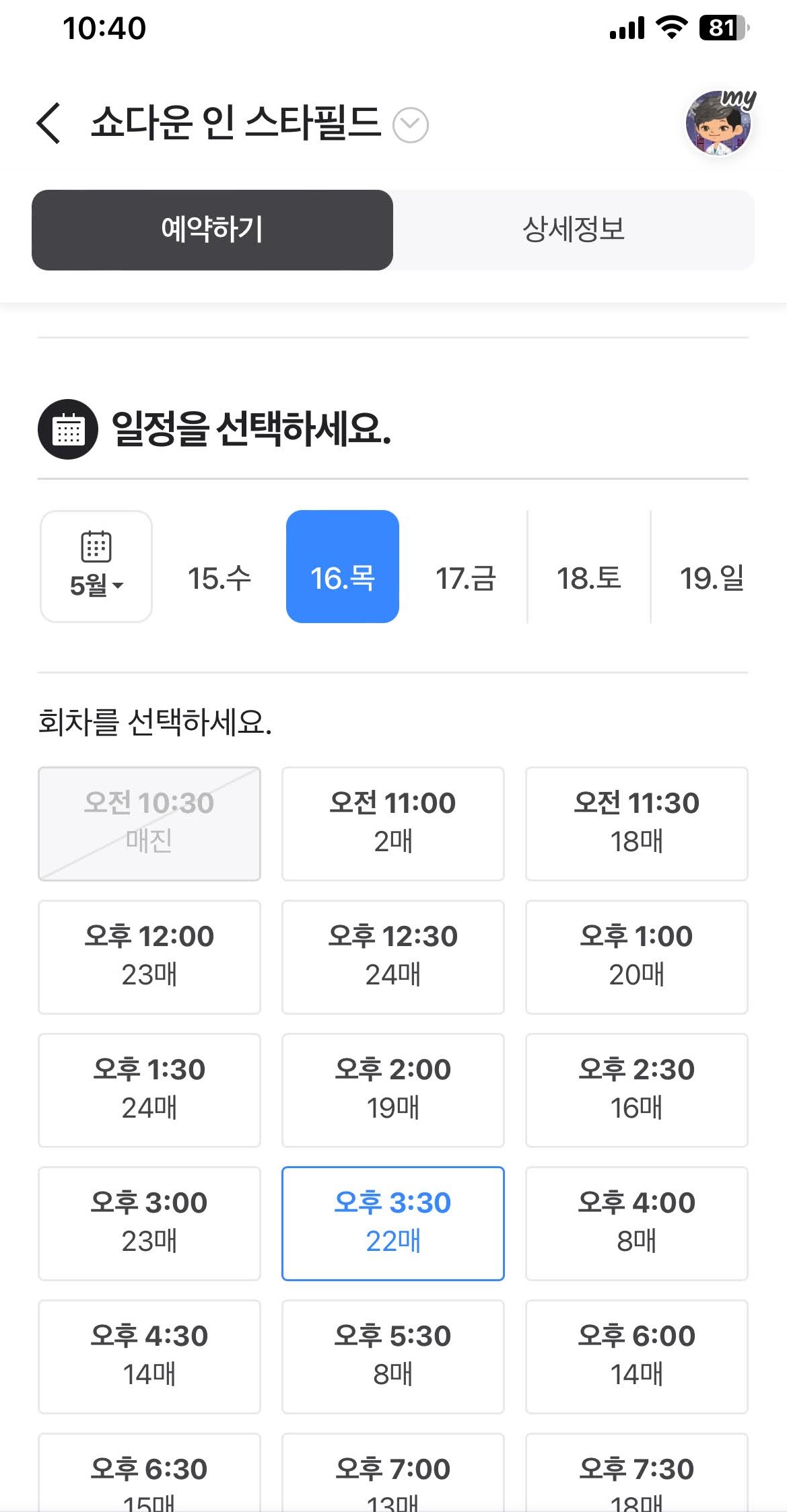 원하는 일자, 시간 확인 후 빠르게 예약을 눌러줍니다.