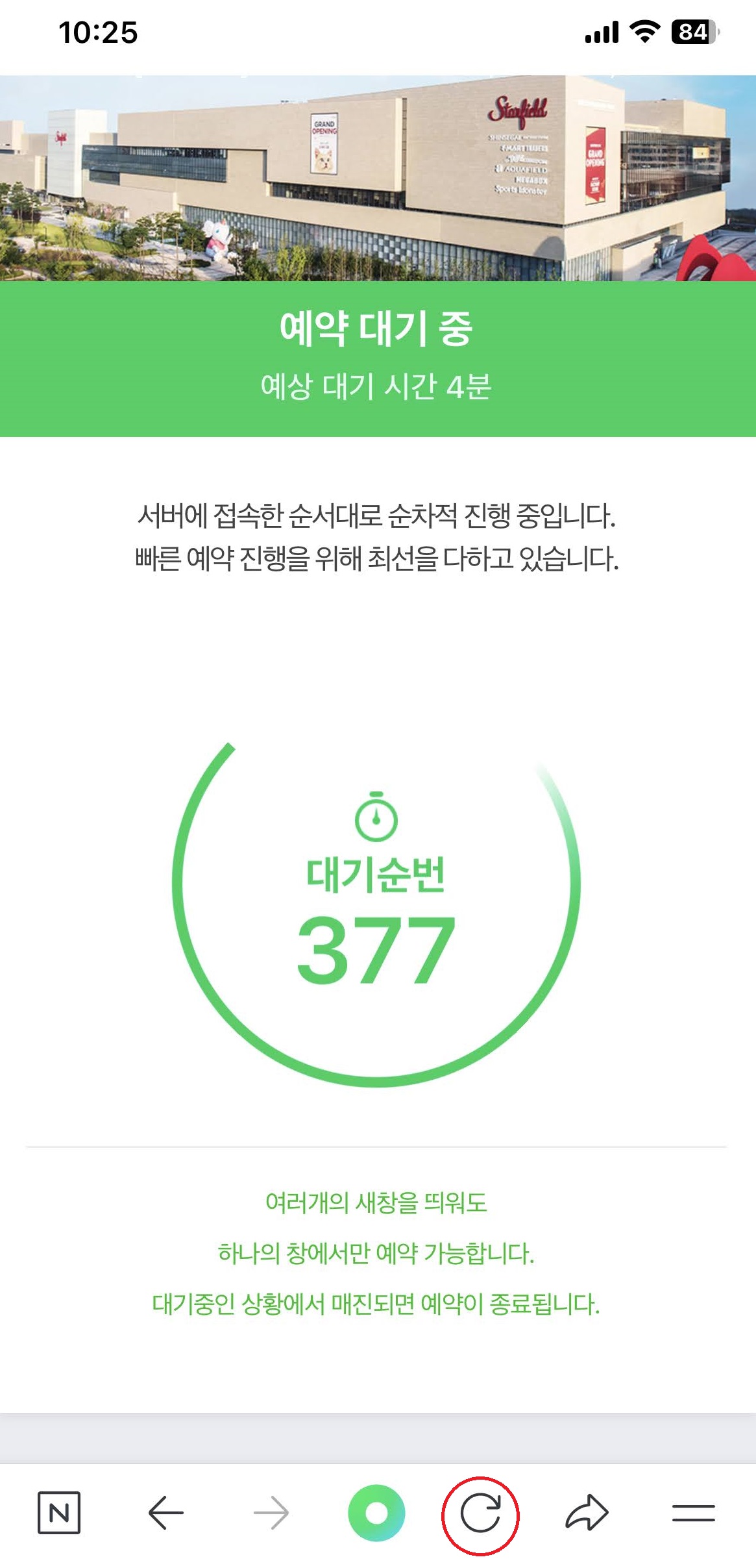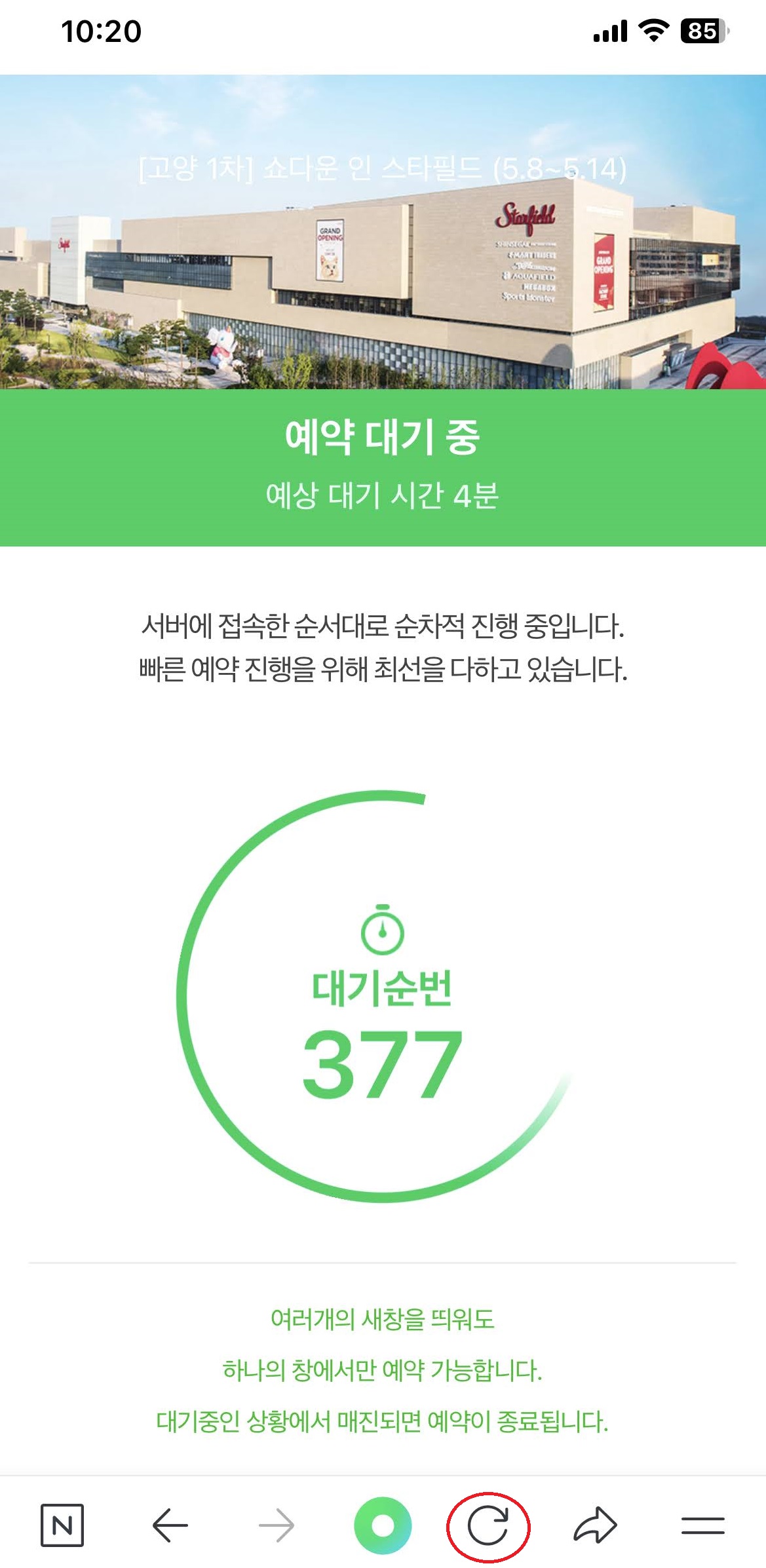 시작 5분 전 접속, 대기순번 변경이 없다면 하단 새로고침 클릭