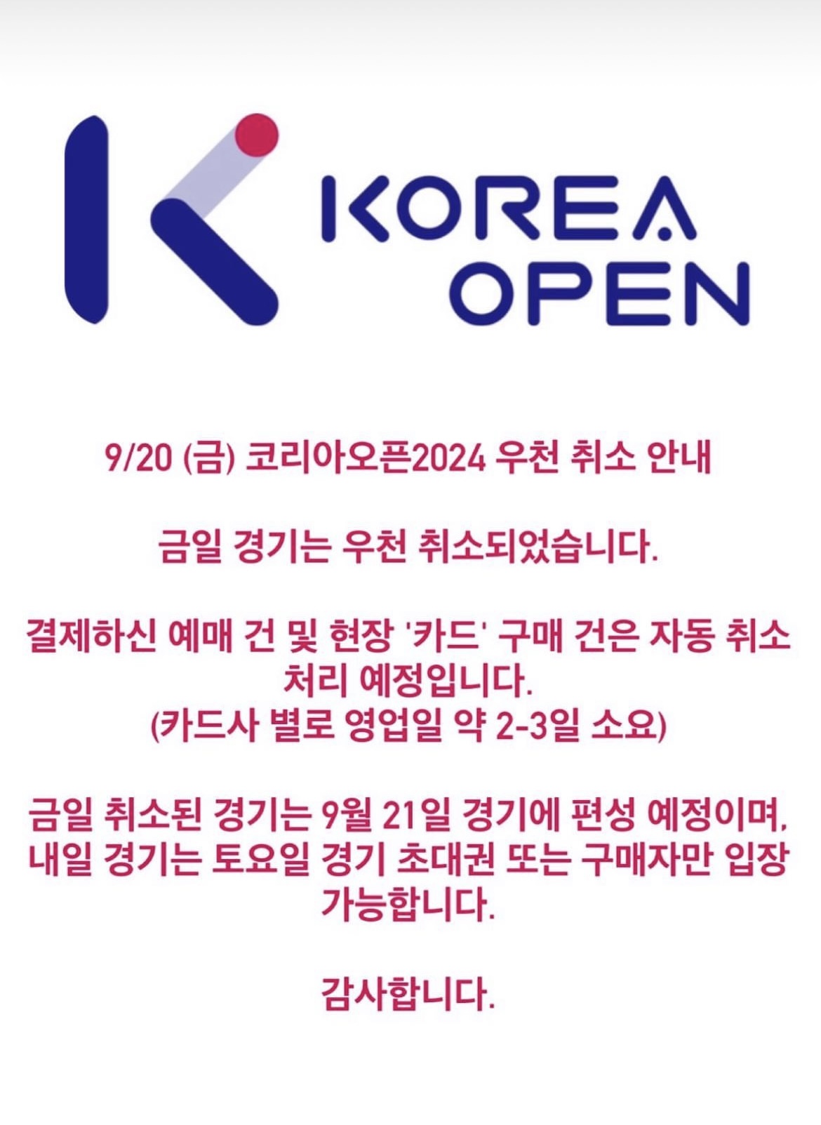 경기 진행 여부는 KOREA OPEN 조직 위원회의 결정이 아닌 WTA 규정에 따라 진행됩니다.