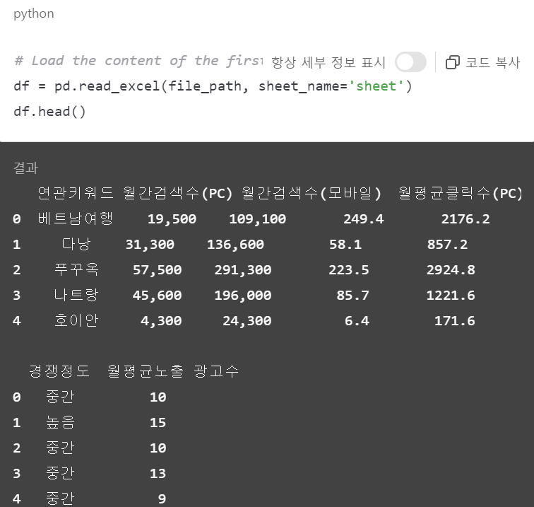 이렇게 나온 키워드를 월간검색수와 클릭수를 비교해서 키워드를 찾아야 합니다.