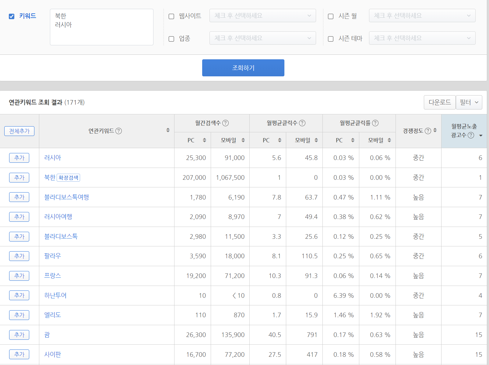 월평균 노출 광고수도 높지 않고, 월간 검색수만 높은 것으로 확인됩니다.