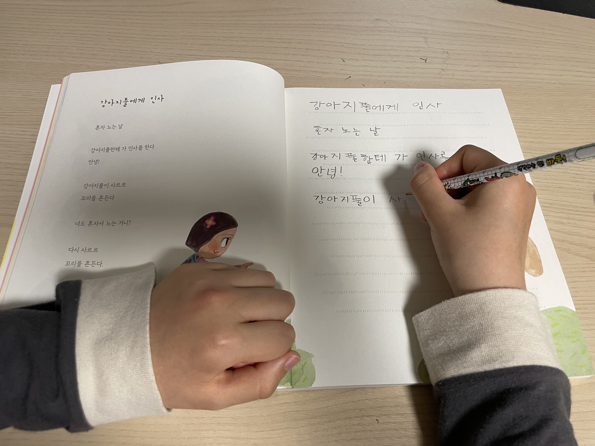 예전에는 동시를 읽고 쓰고, 느낀 점을 적고, 제목을 기준으로 내가 생각하는 동시를 다시 적었던 거 같아요.