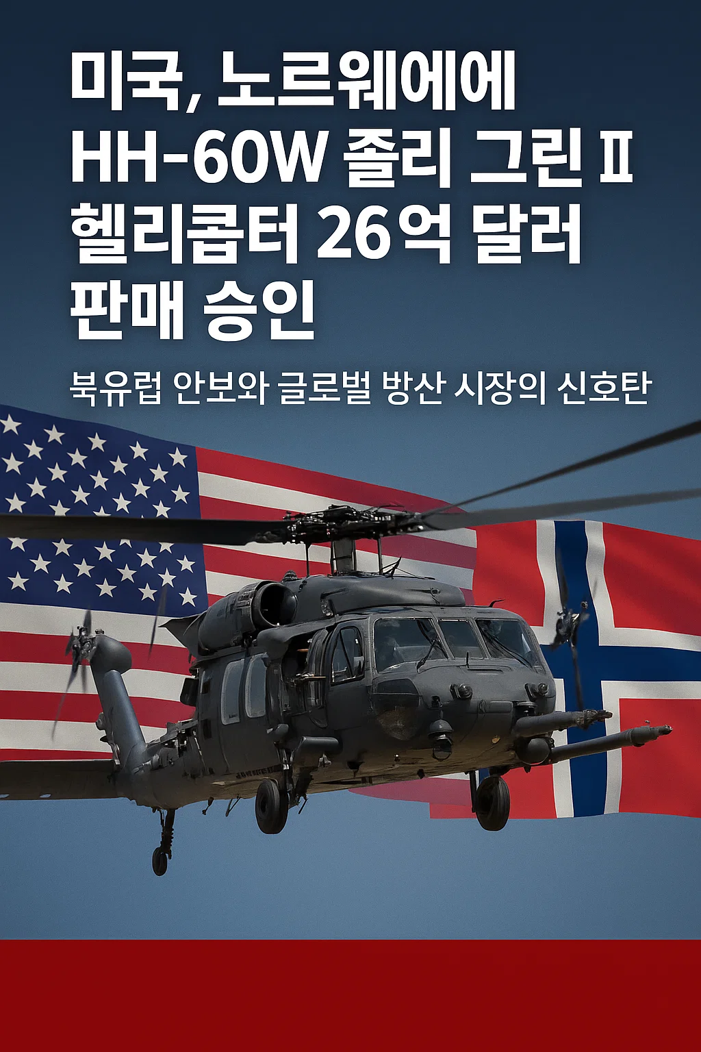 미국 국무부가 노르웨이에 HH-60W 졸리 그린 II 헬리콥터 9대의 판매를 약 26억 달러(한화 약 3조 5,000억 원)에 승인한 소식과, 이 결정이 갖는 군사·외교·산업적 의미를 심층적으로 분석합니다.