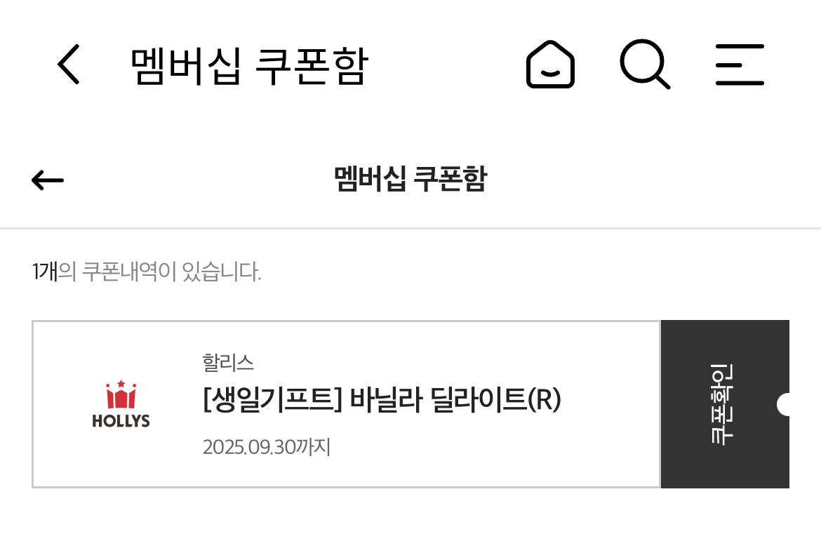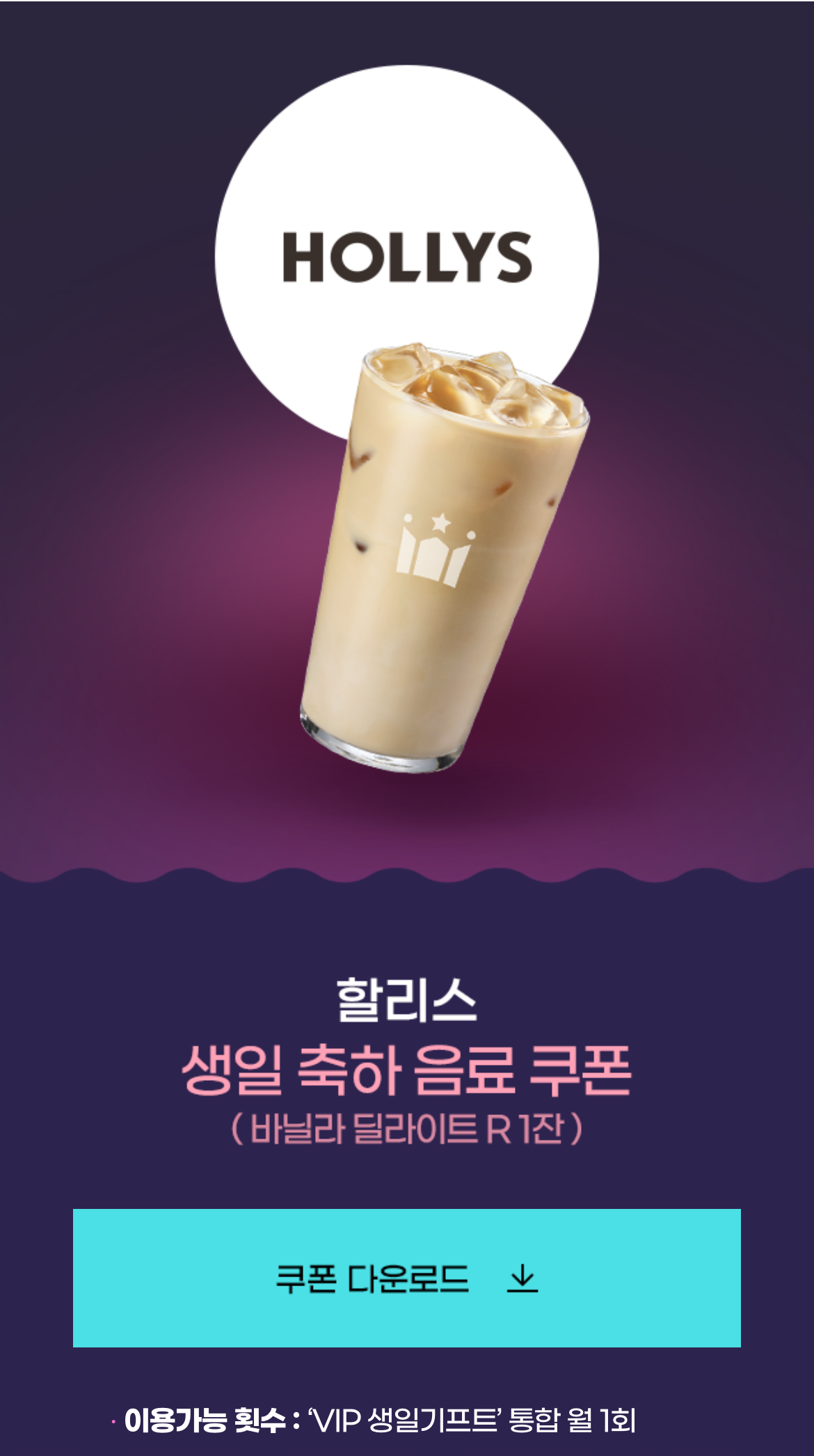 생일기프트로 할리스 바닐라 딜라이트 R 쿠폰 받았습니다.