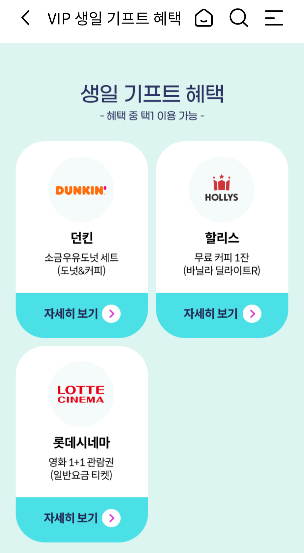 VIP 생일 기프트는 3개 중 하나를 선택할 수 있어요.