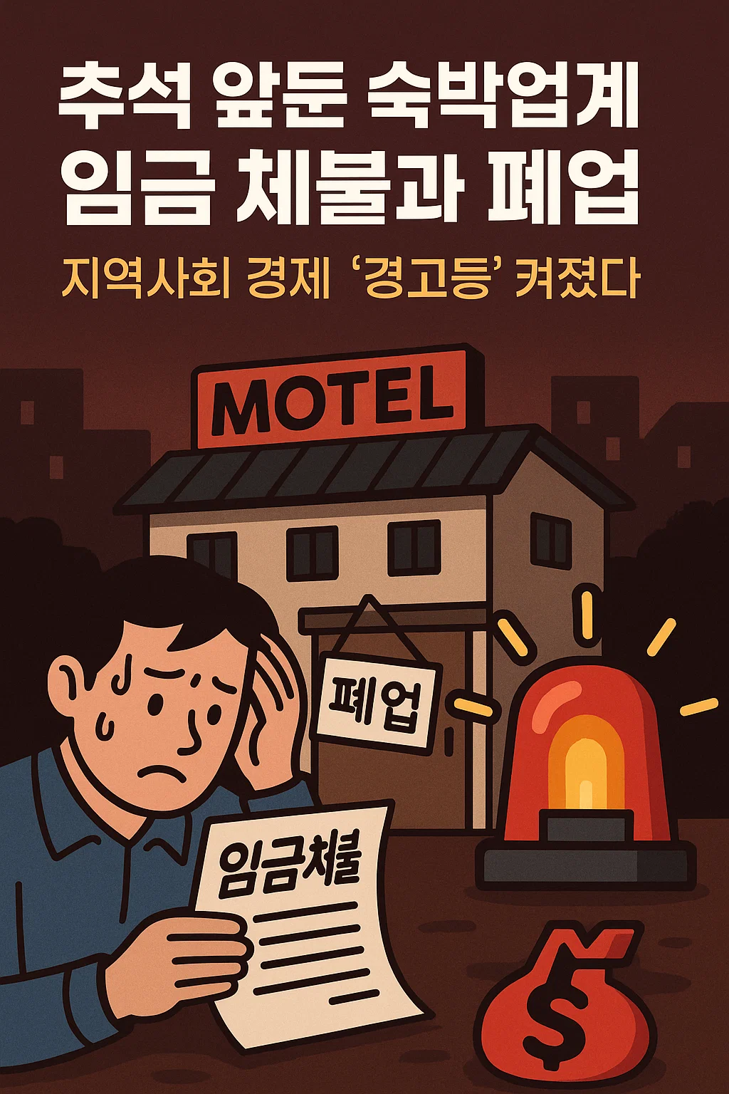 추석 명절을 앞두고 벌어지는 호텔·모텔 임금체불과 폐업, 임대료·세금 미납 사태는 숙박·관광산업 종사자의 생활불안, 지역경제 침체, 공공 신뢰 저하 등 다방면에서 사회적 경고등이 켜졌음을 보여줍니다.