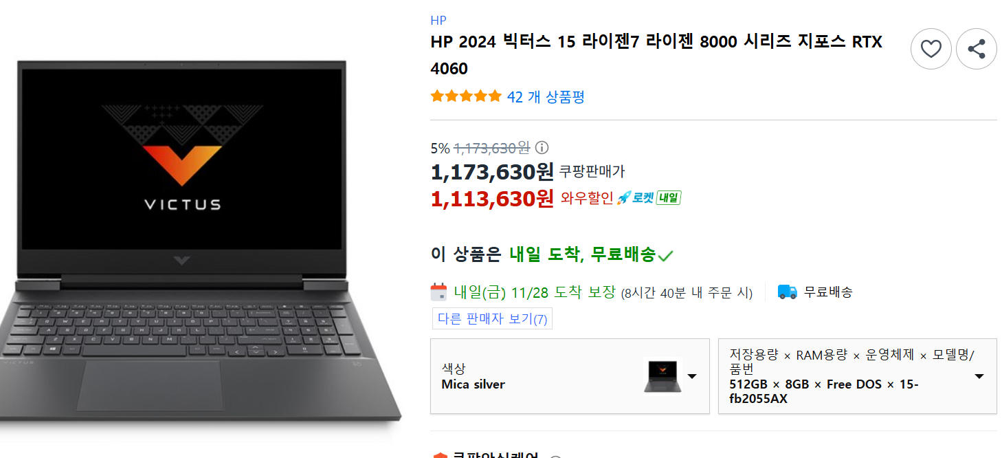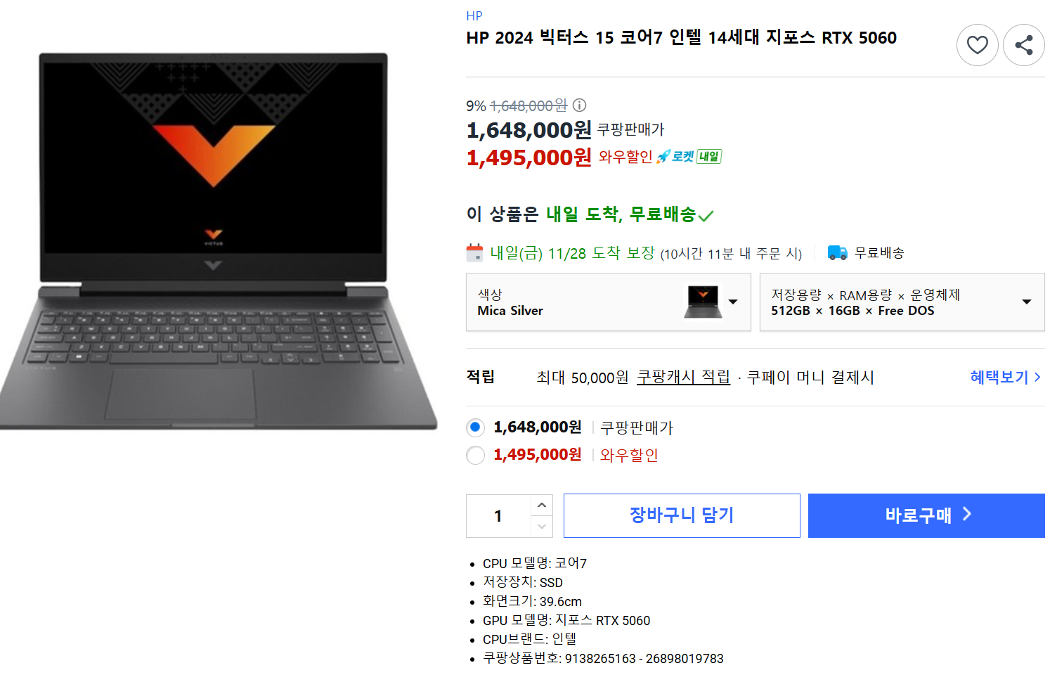 HP 2024 빅터스 15 인텔I7 14세대 RTX5060, RAM 16, SDD 512