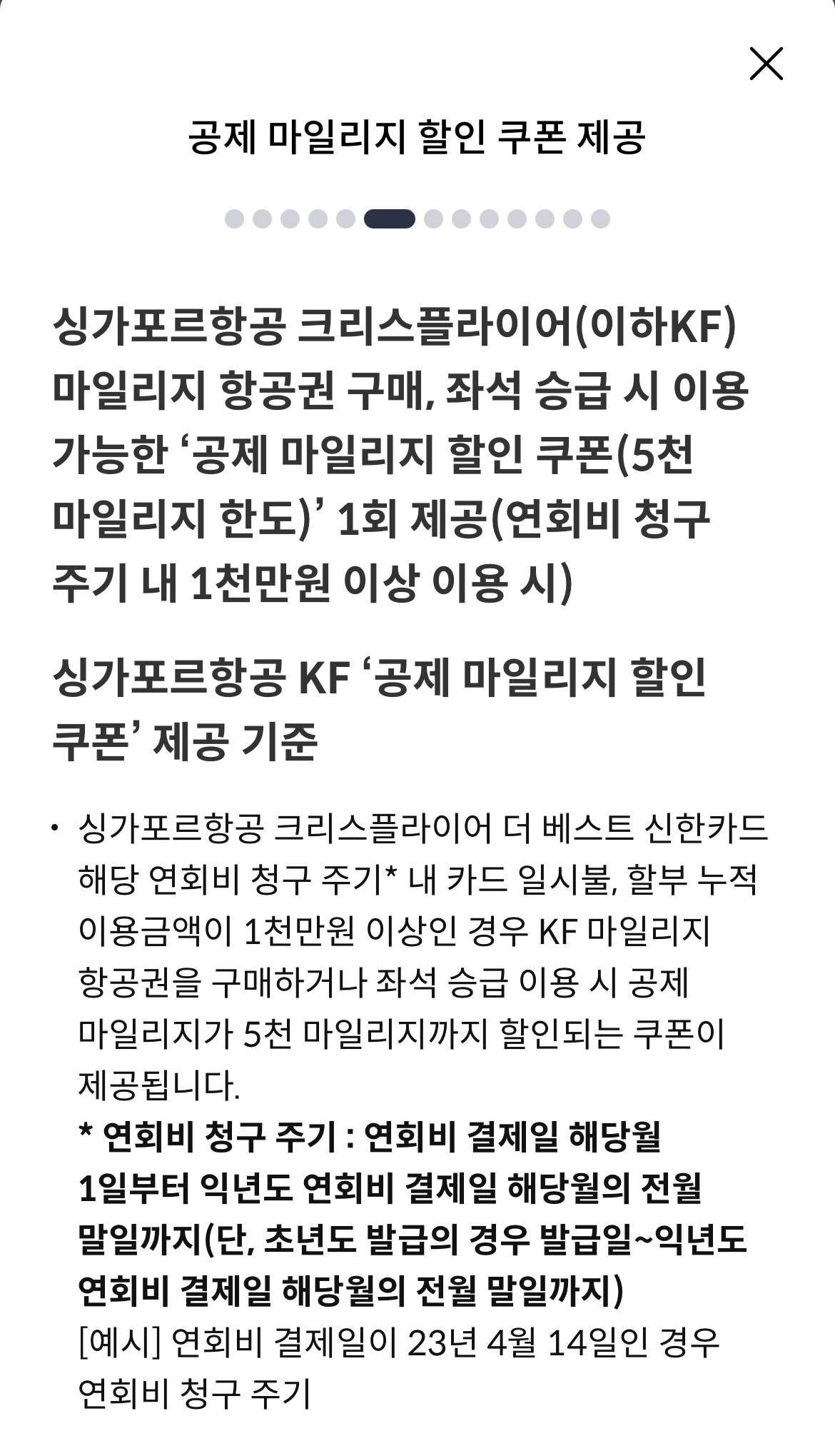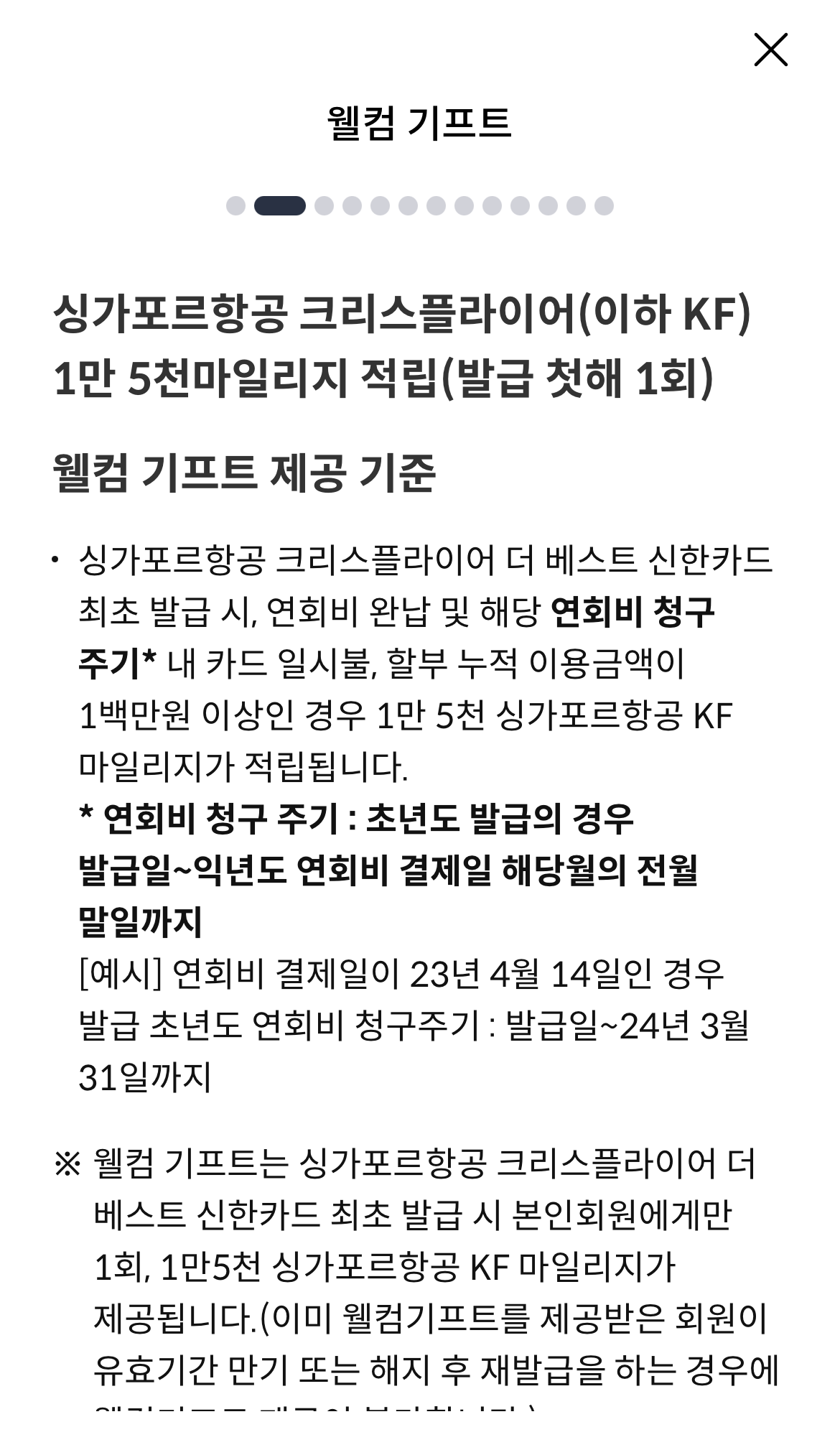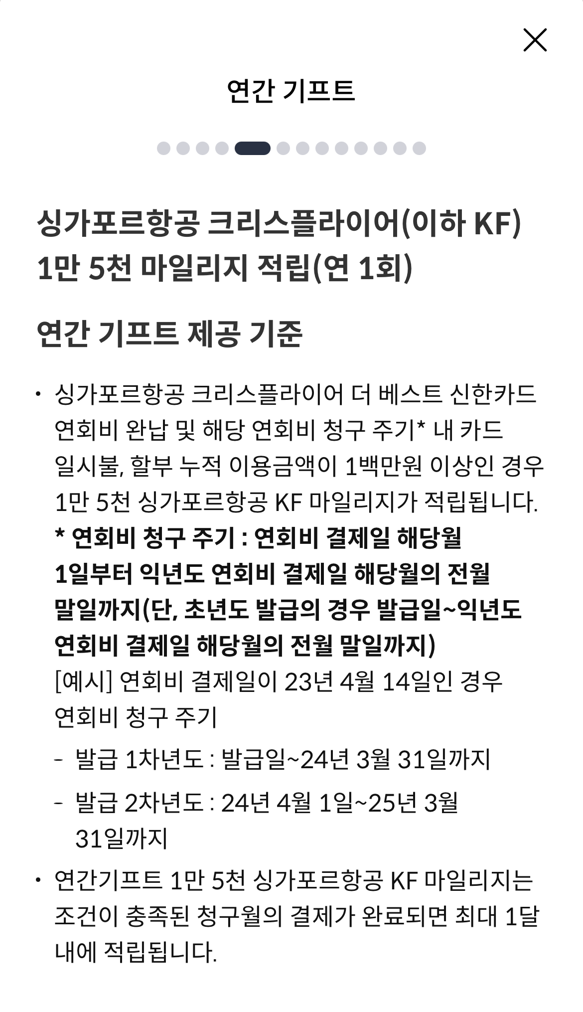 연회비 청구 주기에 누적 이용금액 백만원 이상이면 1만 5천 마일리지 적립