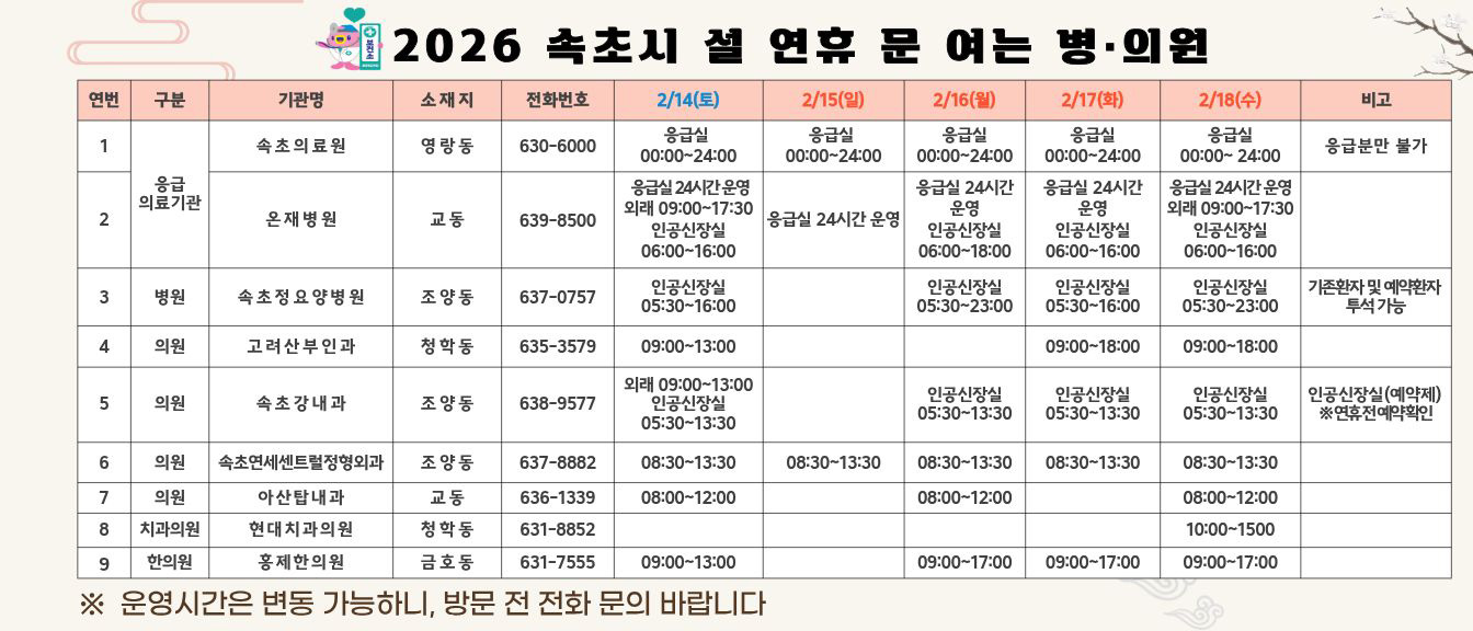 속초, 2026년 속초시 설 연휴 문 여는 병원·의원·약국 완벽 안내